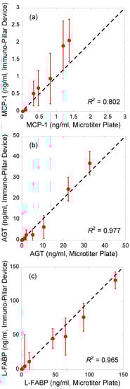 Regression analysis of the correlations between the results obtained using immuno-pillar devices and the conventional ELISA using microtiter plate (a) MCP-1, (b) AGT, and (c) L-FABP. Dashed lines indicate the ideal correlation. The values of coefficient of determination (R2) denote the correlation between the plots and the dashed line.