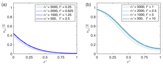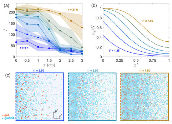 In Figure 3b we report simulation results with parameters: , , , , and . The six times shown are past the diffusion time scale () and are integer multiples of the fitted time increment 1.25, that is, 1.25, 2.50, 3.75, 5.00, 6.25, and 7.50. We plot the ratio of grafted particles to the number of binding sites at a given -location, , vs the simulated domain length () over time. We note similar trends to the experimental measurements, highlighting the increase in the number of grafted particles as time passes, and the decrease when penetrating deeper into the chamber domain.