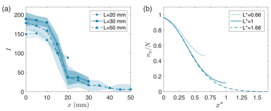 (a) Experimental measurements of fluorescent intensity profile at 16 h for three different secondary interior chamber lengths. Interior secondary chamber dimensions: , with 20 mm, 30 mm, or 50 mm. Shaded regions on each side represent one standard deviation of measurements obtained from at least three independent experiments. (b) Prediction of model at for three different domain lengths with , , , , and , , or . Each curve represents the average result over 500 runs.