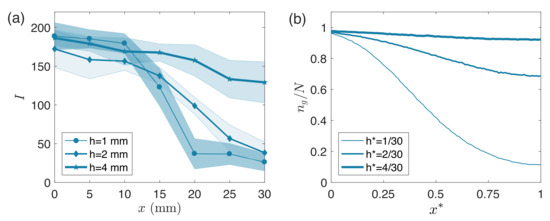 (a) Experimental measurements of fluorescent intensity profile at 16 h for three different secondary interior chamber heights. Interior secondary chamber dimensions: , with 1 mm, 2 mm, or 4 mm. Shaded regions on each side represent one standard deviation of measurements obtained from at least three independent experiments. (b) Prediction of model at for three different domain heights with 1 and 1. To simulate height 0.03, we use and ; for 0.06, we use and ; and for 0.13, we use and . Each curve represents the average result over 500 runs.