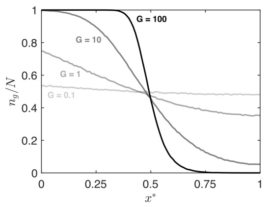 Comparison of predicted surface coverage profiles as a function of parameter G. Each curve is extracted from Monte Carlo simulations at the time when the average surface coverage reaches . In all cases shown, and , with the value of varied to obtain the different G factors (Equation (4)). Each curve represents the average result over 500 runs.