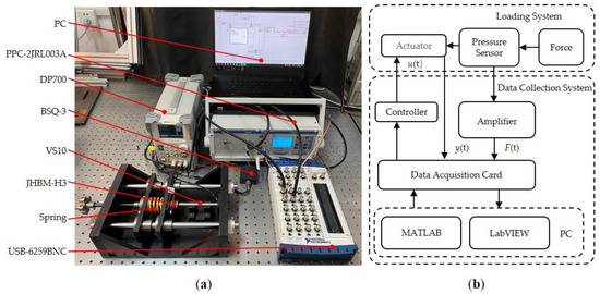 Figure 1b shows the data acquisition system. The reaction force generated by the deformation of the compression spring is applied to the piezoelectric actuator. The compression spring deformation increases when the piezoelectric actuator squeezes the compression spring forward. As a result, the force gradually increases. On the contrary, the backward movement of the piezoelectric actuator results in a reduction in the compression spring deformation, resulting in a gradual decrease in the force.