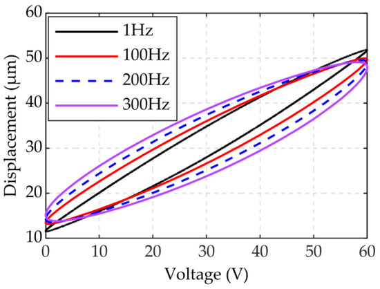 To research the influence of driving frequency on output displacement, the experiment was set up with the piezoelectric actuator placed horizontally on the support base without force. The driving voltage was set to u(t) = 30sin(2πft − π/2) + 30 (f = 1, 100, 200, and 300 Hz). The experimental results shown in Figure 3 indicate that the width of the hysteresis loop gradually increases as the driving frequency increases. However, the amplitude of the displacement is reduced. This phenomenon is called dynamic hysteresis and it is characteristic of piezoelectric actuators [34].