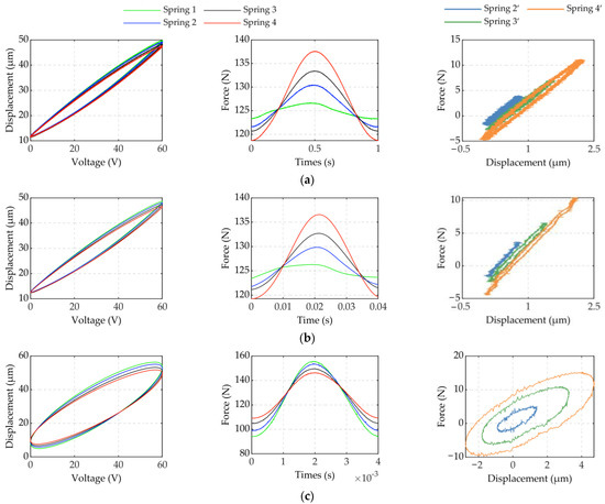 Three groups of experiments were carried out on the experimental platform to research the influence of dynamic forces on piezoelectric actuators (case1: u(t) = 30sin(2πft − π/2) + 30, f = 1 Hz; case2: u(t) = 30sin(2πft − π/2) + 30, f = 25 Hz; case3: u(t) = 30sin(2πft − π/2) + 30, f = 250 Hz). These experiments were performed with different compression springs (spring 1, spring 2, spring 3, or spring 4). The preload applied to the piezoelectric actuator was 120 ± 0.5 N, which was adjusted by the handwheel and measured by the pressure sensor.