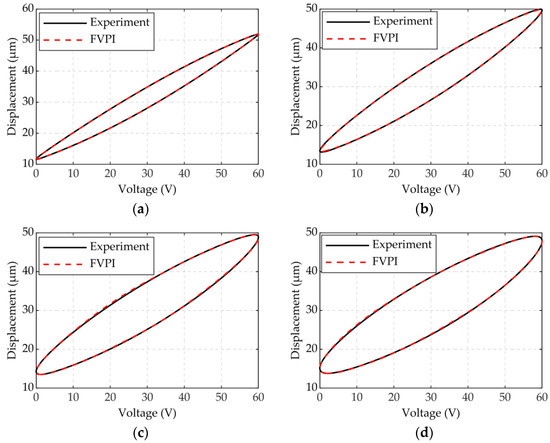 In experiment 2, the input voltage was set to: u(t) = 30sin(2πft − π/2) + 30 (f = 250 Hz, t = [0,0.004]). The threshold was set to r = [0,6,12,18,24,30,36,42,48,56,60]. Table 3 shows the results of the parameters identified by the DE algorithm in experiment 2. Experiment 2 was carried out under compression springs of different stiffness to verify the performance of the FVPI model in describing dynamic hysteresis with force-voltage coupling and the results were compared with the DDPI model.