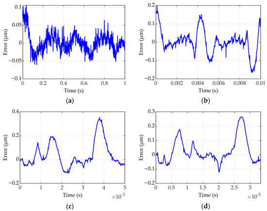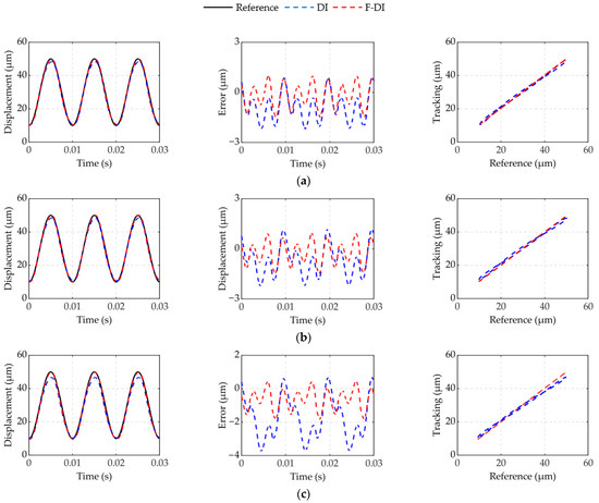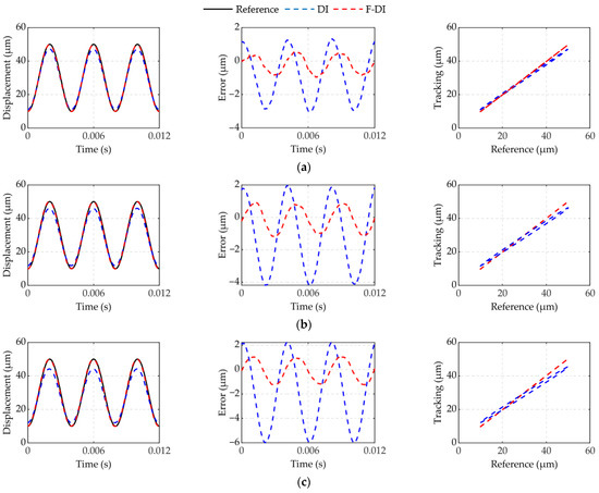 Figure 13 and Figure 14 show the experimental results of feedforward compensation driven in 100 and 250 Hz under different forces. The experimental results show that the F-DI compensator can more effectively compensate for dynamic hysteresis with force-voltage coupling than the DI compensator. Compensators were evaluated using the maximum absolute error. Table 4 shows the maximum absolute error results of the F-DI compensator and the DI compensator in 100 and 250 Hz under different dynamic forces. The error of the F-DI compensator was reduced by 60% compared to the DI compensator. The effect of the DI compensator worsened with the increase in force and frequency. However, the F-DI compensator still had a higher compensation accuracy. In experiment 1, the maximum error was reduced from 9.3% to 4.6%. In experiment 2, the maximum error was reduced from 15% to 3.1%.