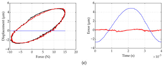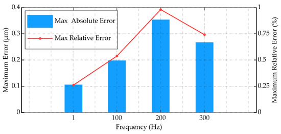 The result of experiment 1 is shown in Figure 5 and Figure 6. In Figure 5, the FVPI model describes the dynamic hysteresis of the piezoelectric actuator in 1–300 Hz without force. Figure 6 shows the error of the FVPI model. The results show that the FVPI model can accurately describe dynamic hysteresis. The maximum absolute error and maximum relative error were used to evaluate the accuracy of the FVPI model. Figure 7 shows that the maximum absolute error increased from 0.10 to 0.38 µm and the maximum relative error increased from 0.26% to 0.88% when the driving frequency increased from 1 to 300 Hz. The accuracy of the FVPI model decreased slightly with increasing frequency and the maximum relative error was below 1% in experiment 1.