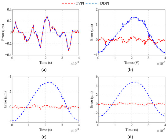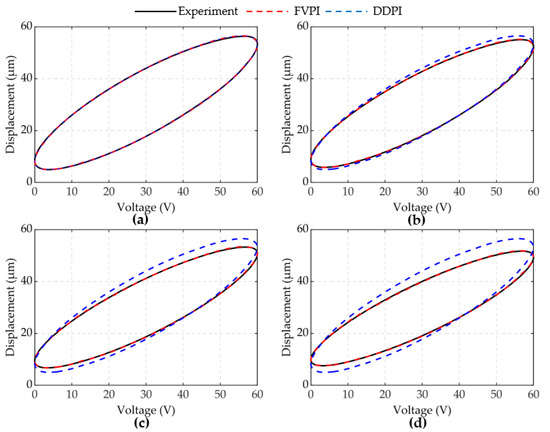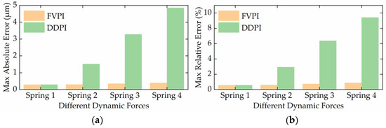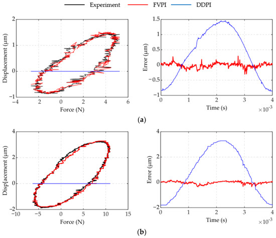 The results of experiment 2 are shown in Figure 8 and Figure 9. Figure 8 shows a comparison of the FVPI and DDPI models with the experimental data at 250 Hz driving frequency, under different forces. Figure 9 shows the error of the two models. The results show that the FVPI model can more effectively reduce the errors caused by force than DDPI model. Figure 10 shows that the maximum absolute error of the FVPI model increased from 0.30 to 0.39 µm as force increased. However, the output displacement amplitude of the piezoelectric actuator decreased when the force increased, resulting in a faster increase in the maximum relative error from 0.57% to 0.89%.