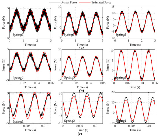 Comparison between the actual dynamic force and the estimated force at different frequencies: (a) 1; (b) 50; (c) 250 Hz.