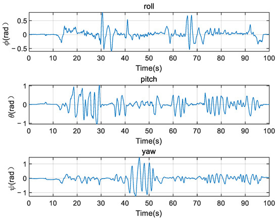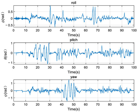 diverges. If we obtain the attitude angles by orthogonally decomposing the acceleration according to Equation (12), there will appear to be high-frequency noise, which will result in the angles’ inaccuracy, as is shown in