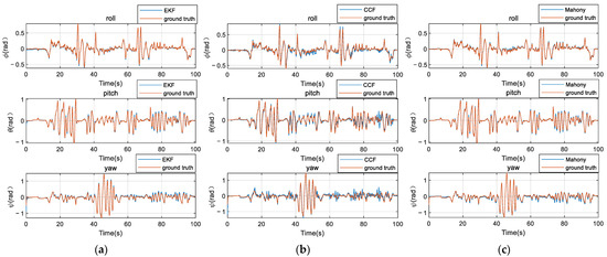 Figure 10 that the attitude angle can be effectively estimated by using quaternion EKF, CCF, and Mahony complementary filtering algorithms. When quaternion EKF is implemented, due to the randomness of the initial value in the algorithm, the estimated value of the attitude angles is quite different from the true value at the beginning. However, as iterations increase, the estimated value of the attitude angle gradually converges to the true value, which has a fast convergence rate. The results of CCF are less impressive, but it has a simple calculation with fast response. Mahony complementary filtering inherits the advantages of EKF, the convergence rate is fast, and the estimated attitude angles quickly converge to the true value at the initial state.