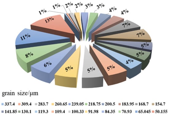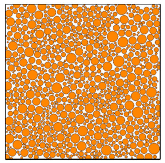 It was found that the number ratio of different particles is related to their corresponding particle size. According to the size distribution of AP particles in propellant obtained through a real test given in the literature [20], the number fraction of particles with corresponding size can be calculated, as shown in Figure 1. Furthermore, the mesoscopic particle filling model of HTPB propellant can also be established (Figure 1).