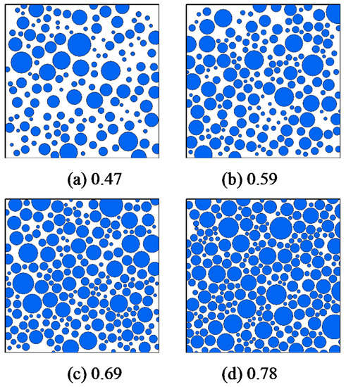 Four groups of propellant mesoscopic filling models with different filling volume fractions were established to explore the influence of different propellant particle filling volume fractions on their macro mechanical properties in this study (Figure 3). The corresponding particle volume fractions of the model were 0.47, 0.59, 0.69, and 0.78 (Figure 3).