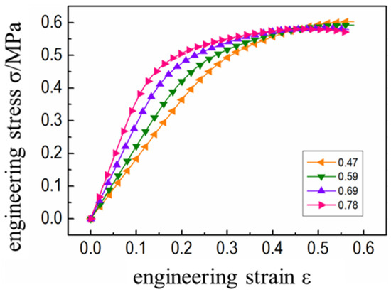 In this study, the meso-mechanical model of HTPB propellant with different filling volume fractions was numerically calculated. The stress-strain curve of the corresponding calculation results is shown in Figure 4. It was found that the initial slope of the tensile stress-strain curve of propellant with different particle volume fractions is quite different (Figure 4). The larger the particle volume fraction, the greater the curve slope and the earlier that the curve entered the nonlinear section. This was because the particle volume fraction significantly determined the initial modulus of the propellant, which determined the time when the mesoscopic stress in the propellant reached the critical value of interface damage. Further, it was found that the larger the volume fraction of filled particles, the greater the initial modulus of the propellant and the faster the internal mesoscopic stress transfer. The stress at the particle/matrix interface reached the damage critical value at the earliest and the “dehumidification” damage began to appear. Therefore, the corresponding stress-strain curve entered the nonlinear section at the earliest until the final fracture failure of the propellant. It was also evident that after propellants with different particle volume fractions entered the stress “platform area”, the volume fraction increased whereas the degree of stress declined (Figure 4). This indicates that the mechanical properties of HTPB propellant with higher volume fractions decline more violently due to “dehumidification”, which is consistent within the previous literature [21].