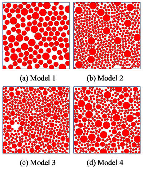 According to the ratio results (Table 4), the final four mesoscopic filling models of propellants with different particle gradations are shown in Figure 5. The different particle gradations finally show meso-mechanical models with different filling fullness (Figure 5). Model 1, containing only AP particles with larger particle size, was sparsely filled and was not dense enough. In the model with a small particle size, the particles were embedded in the gap between large particles, the filling structure was closer, and the filling performance was better than the model with larger particles.