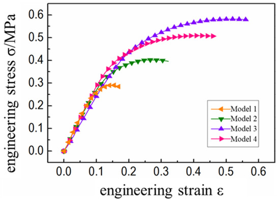 The stress-strain curves of HTPB propellant with different particle gradations were as shown in Figure 6. It was observed that on the premise of a certain particle volume fraction, the initial modulus of propellant was not affected by particle gradation. Only Model 3 composed of small particle size particles had a slightly lower initial modulus than the other three graded propellants, as shown Table 5. This shows that the enhancement effect of larger particle size on the mechanical properties of propellant is more obvious. The difference in mechanical properties of graded propellants is mainly reflected in the nonlinear section.