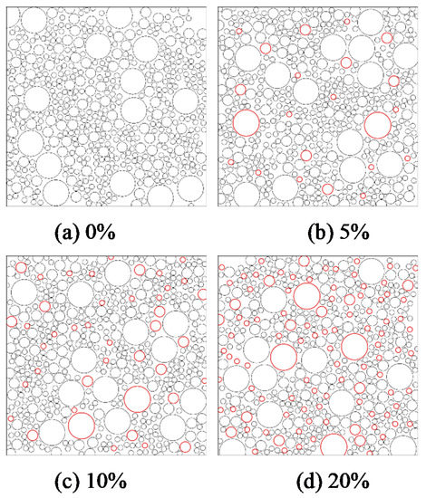 To study the influence of mesoscopic interface bonding defects on its macro mechanical properties, it is necessary to establish a propellant mesoscopic particle filling model with interface defects [23]. During modeling, the mesoscopic component parameters selected the propellant meso-mechanical model 4 as the object and established four groups of models with initial interface defect contents of 0%, 5%, 10%, and 20% as shown in Figure 8.