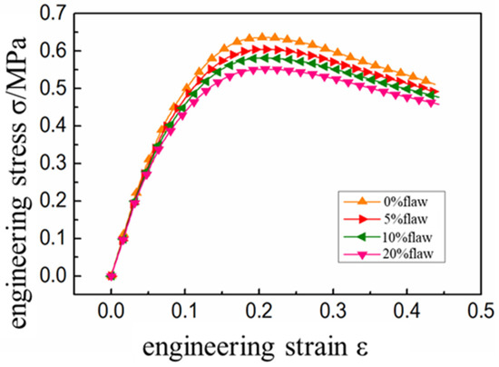 It was evident that the existence of interface defects reduces the initial modulus of the propellant, and the higher the defect content, the more intense the modulus decreases (Figure 9). This is because the defect interface is defined as a failure element, which does not transfer load during tension [24,25]. Therefore, at the initial stage of load, the model with more initial defects has worse load bearing capacity. The corresponding stress value is lower under the same strain level. The existence of the initial defects reduces the tensile strength of the composite solid propellant. This was mainly because the interface defects were always in the failure state and the particles at the interface cannot play the enhancement effect [26]. This obviously reduces the overall strength of the propellant and the higher the defect content, the lower the tensile strength of the propellant.