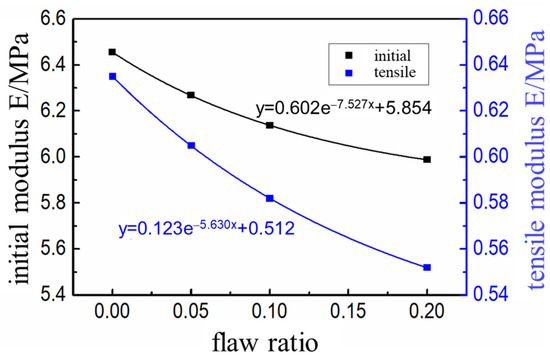 According to the initial modulus Ein and tensile strength σm of the propellant with interface defect content in Table 6, an exponential relationship was established. The exponential function was selected to fit the relationship and the corresponding fitting results were as shown in Figure 10.