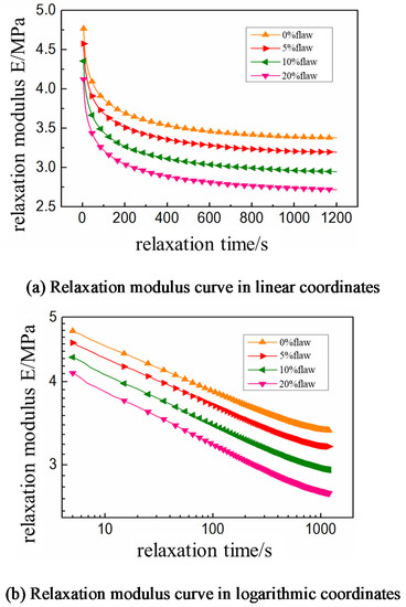 It can be seen from Figure 11 that the values of stress relaxation curves of HTPB propellant with different interface defect contents are different. However, the overall trend is the same, and the higher the content of interface defects, the lower the relaxation modulus of the propellant. It shows that the interface defects in the propellant only affect the relaxation modulus, not the relaxation rate, because the relaxation characteristics of the composite solid propellant are determined by the properties of the matrix material, which is irrelevant with the initial defects during the preparation process [28].
