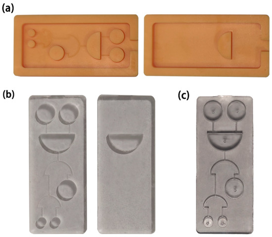 As an emerging manufacturing technology, 3D printing has the characteristics of individuation and high precision. It has been widely used in miniaturized mechanical and electromechanical elements to efficiently manufacture microdevices in recent years [28,29]. We used a high-precision desktop 3D printer to make the molds of the microfluidic chip (Figure 1a). After cleaning, curing, and polishing the molds, gloss oil was sprayed on the molds to facilitate curing and stripping, and to improve the surface roughness of the double PDMS layers. We then mixed the PDMS and curing agents with a mass ratio of 9.5:1 and removed the bubbles in a vacuum drying oven, before pouring them into molds. We stored the molds at 85 °C for 60 min to cure the PDMS and then demolded the double PDMS layers (Figure 1b). The plasma cleaner modified the surface of the double PDMS layers and made them bond tightly after pressing (Figure 1c).