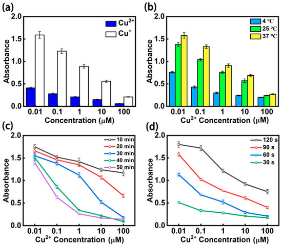 Optimization of operating conditions for the enzyme method-based microfluidic chip: (a) inhibition effect of Cu2+ and Cu+ on HRP activity. (b) Effect of temperature on the operation of chip. (c) Influence of incubation time on signal intensity. (d) Detection results at different readout times.