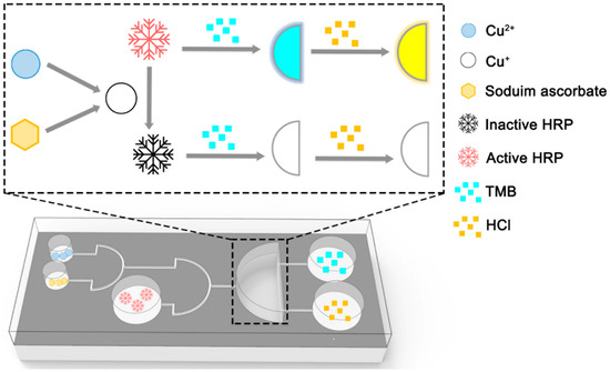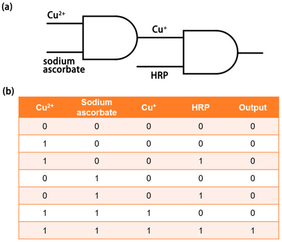 Based on an enzyme method, the microfluidic chip constructs two AND gate structures in series (Figure 6a). Cu2+ and sodium ascorbate are inputs of the first AND gate. Cu+ produced by reduction reaction is the output of the first AND gate and one of the inputs of the second AND gate. The other input of the second AND gate is HRP. Inhibition of HRP activity is the output of the second AND gate. The reagent is ‘1’ in the presence and ‘0’ in the absence. TMB outputs HRP activity by color as the start key of the enzyme method-based microfluidic chip aspired biological logic gate. HCl acts as the end key of the biological logic gate to terminate the reaction in the reaction reservoir and make the solution present its final color. The output of the whole biological logic gate is ‘0’ for a yellow solution and ‘1’ for a colorless solution. It can be seen from the truth table of the biological logic gate that the final output will be ‘1’ only when the three inputs of Cu2+, ascorbic acid, and HRP are ‘1’ at the same time (Figure 6b). The result satisfies the reality of the double AND gate series. Since Cu2+ and sodium ascorbate are inexpensive reagents, and unlabeled HRP is common, the cost of biological gates is low. It means that visual biological logic gates have potential applications in biological computers.