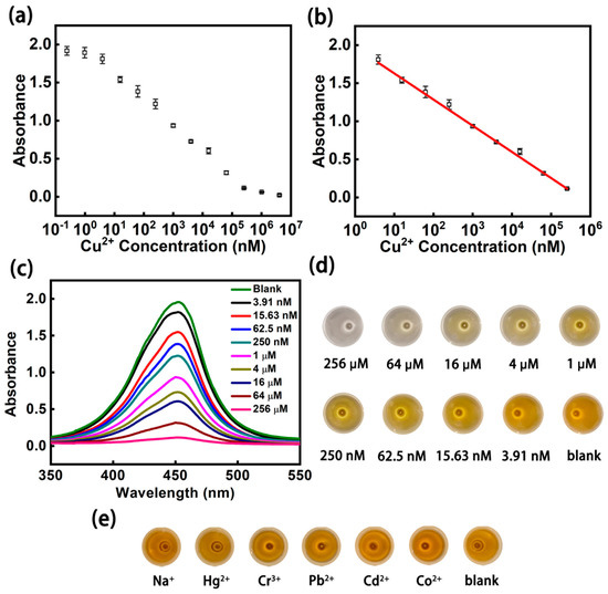 The detection performance of the biological logic gates: (a) detecting results of Cu2+ in the range of 0.24 nM–4096 μM. (b) Linear curve of Cu2+ at 3.91 nm–256 μM. (c) Uv-vis spectra of Cu2+ at different concentrations in the linear range. (d) Color results of different concentrations of Cu2+ in the linear range. (e) Color results of other metal irons.