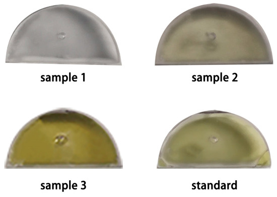 To verify the performance of the enzyme method-based microfluidic chip in detecting actual seawater samples, we collected three seawater samples with different levels of pollution (Lianyungang, China). The standard color sample was obtained by detecting the standard solution of 0.16 μM Cu2+, which the China Sea Water Quality Standard requires. We performed real-time detection at the sampling site and read out the microfluidic chip’s signal intensity with the naked eye (Figure 5). The color of the solution in the reaction reservoir was compared to the color of the standard sample to determine the pollution level. A sample solution from the chip was tested in a lab setting using a spectrophotometer to acquire precise data. Results of the two readout methods of the chip were compared with those of ICP-OES as a reference (Table 1). The results showed that the naked eye readout could judge pollution and that using the spectrophotometer results could accurately detect Cu2+ concentration.