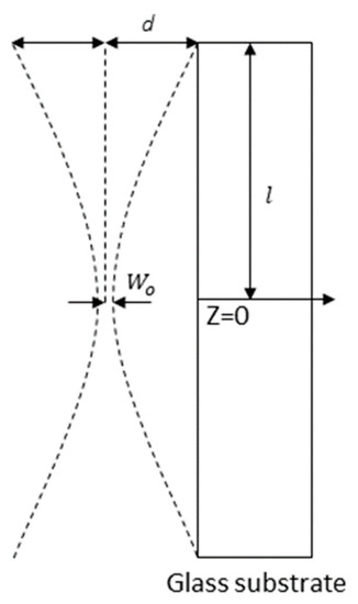 The focused laser beam was irradiated in a direction parallel to the surface of the glass substrate with a small gap between the focused beam and the surface of the glass substrate, as shown in Figure 2, where W0 is the radius of the focused laser beam, d is the gap distance, and l is the half length of the glass substrate.
