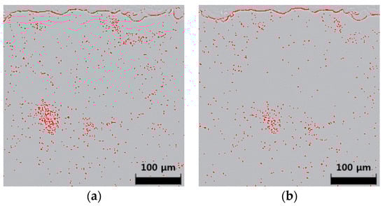 Photos of a glass substrate sprayed with SiO2 particles observed using a 10× magnification microscope (MM-800, Nikon, Tokyo, Japan) and particle analyzer software: (a) immediately after the application of particles and (b) at one minute of air spray cleaning.