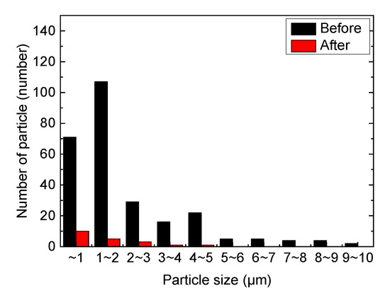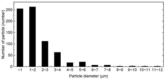 Particle analyzer software (InnerView 2.0, Innerview Co., Ltd., Seongnam, Korea) was used to analyze particle size and density. We analyzed the distribution of particles by size, as shown in Figure 4. Particles less than 3 μm in size occupied over 80% of the area. The sizes of the particles varied from 0.8 to 11.4 μm, and the average particle size was 1.7 μm. The ratio of particles occupying an area from a certain field of view was 0.4%, and the results are summarized in Table 1.