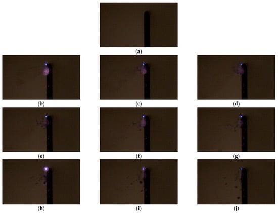 In Figure 5, the particle removal process is visualized using a high-speed Charge coupled device (CCD) camera (Chronos 1.4, Kron Technologies, San Diego, CA, USA). The frame rate of the camera was approximately 10,000 fps and the interval of the frame was 93.65 μs. The pulse-to-pulse interval was 20 ms. In our previous research works for wide area cleaning, thermal damage was not observed with a 70 μm gap during a 2 min laser deposition. The laser beam was focused at the top of the glass substrate with a 70 μm gap. To illustrate the removal process clearly, the quantity of particles introduced was nearly ten times the typical quantities observed in real-life situations. Figure 5a shows the moment before the laser irradiation and removal motions are shown at various time domains in Figure 5, which shows the focused beam shape and movement of the removed particles at different times. The plasma of the focused beam is shown in Figure 5b–h and it reaches the maximum density in Figure 5h. After the force of attachment between the particles and the glass substrate is weakened by the laser shock wave pressure, the particles may fall due to gravity.