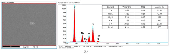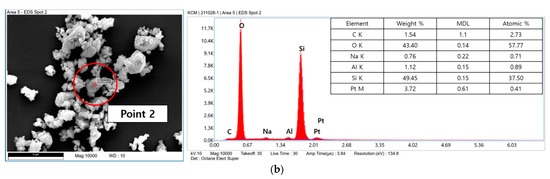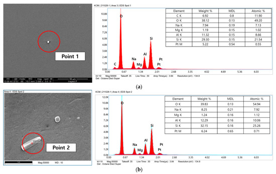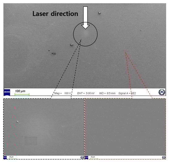 Before analyzing thermal damage in the LSC process, the glass substrate and SiO2 particles were observed by scanning electron microscope (SEM) images and energy dispersive spectroscopy (EDS) profiles, as shown in Figure 6. The glass substrate with a 300 × 300 μm area was scanned and the element compositions were averaged with the scanning area. The SiO2 particle was selected. The difference in the composition of the SiO2 particle with that of the glass substrate is that the carbon element appears in the SiO2 particle and the percentage of weight of silicon is higher in the SiO2 particle.