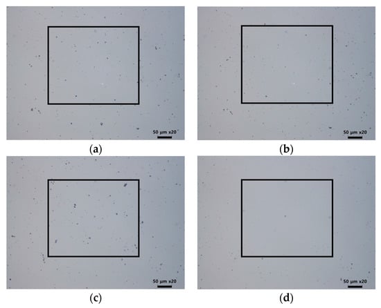 To remove particles smaller than 1 μm in size, the gap distance must be optimized. As shown in Figure 2, the gap distance required to avoid contact with the glass substrate was predicted assuming the theoretical Gaussian beam propagation. The radius of the focused beam, W0, was measured to be 7.9 μm using a focused beam profiler (FM100-focus Monitor 100, Metrolux, Berlin, Germany). Using this beam diameter, the gap distance required to avoid contact with the surface of the glass substrate (l = 300 μm) was predicted to be 14.4 μm. Subsequently, we investigated the damage to the glass substrate at d = 10 μm and 20 μm, as shown in Figure 11. Three selective positions on the glass substrate at d = 10 μm after 110 pulses were applied are shown in Figure 11a. The top of the glass substrate was broken, and the damaged area propagated above the laser beam path. However, no damage was observed in any of the four positions when the gap distance was 20 μm, as shown in Figure 11b.