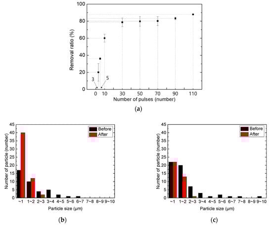 (a) Particle removal ratio with number of pulses. (b,c) Change in particle distribution after LSC process with different pulse numbers: (b) pulse number = 30; (c) pulse number = 110.