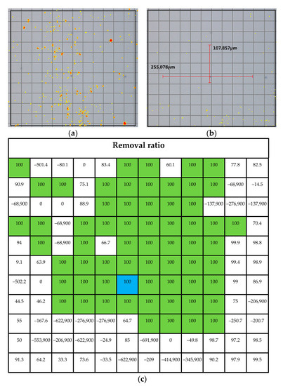 (a) Photo of before cleaning when pulse number is 110 number and gap distance is 20 μm, (b) photo after cleaning of (a), and (c) particle removal ratio map.