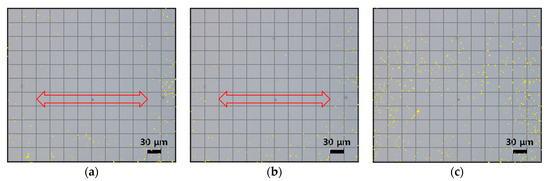 The density of particles was set at values of 0.4%, 0.8%, and 6%, as shown in Figure 12. Compared to the case of 0.4% density, the particles were more concentrated in the center in the case of 0.8%, as shown in Figure 12c. In the 6% density case, particle aggregation was observed. Regardless of the density and concentration of the particles, a laser cleaning efficiency of over 95% was achieved with the previously inferred LSC conditions, with a pulse number of 110 and a gap distance of 20 μm. These results show that the LSC process can be applied when the particle density is high and when there is a possibility of particle aggregation.