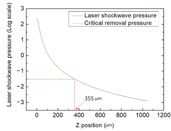 where is the van der Waals force; h is the Lifshitz–van der Waals constant, which is calculated as ; A is the Hamaker constant, which is calculated as ; Z is the atomic separation 4 Å; r is the radius of the particle; and is the radius of the contact area of the particle. The diameter of the particle was assumed to be 1.7 μm, which was the average particle size in the experimental study. Using Equation (4), the distance at which the critical removal pressure and laser shock wave pressure is equal was calculated to be 355 μm, which means that a particle with a 1.7 μm diameter size can travel until this distance in the corresponding LSC process. This prediction is slightly greater than the experimental results. This theoretical approach assumes that a single particle travels, and the interaction between particles is neglected.