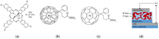 The molecular structure of (a) vanadyl 2,11,20,29-tetra tert-butyl 2,3 naphthalocyanine (VTTBNc), (b) [6, 6]phenyl-C61-butyric acid methyl ester (PC61BM), (c) [6, 6]phenyl-C71-butyric acid methyl ester (PC71BM) and (d) a schematic diagram of organic photodiode.