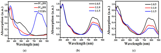 Figure 2 shows the absorption spectra of the single-component material and the blended films from the 300 nm to 900 nm wavelength region. Figure 2a illustrates the absorption spectra of the VTTBNc, PC61BM and PC71BM. It was observed that VTTBNc exhibits two broad peaks at B-band (333 nm) and Q-band region (761 nm and 810 nm). These absorption peaks are similar to the absorption spectra reported by Dhanya and Menon (2012) [20]. The absorption peak at the B-band correlates to the excitation of localized π-π* transition that occurred between the bonding and anti-bonding molecules. Meanwhile, the absorption peak at the Q-band is related to the charge transfer within the core unit [20,21]. Next, PC61BM reveals a maximum absorption peak located at 335 nm, and PC71BM has several shoulder peaks observed at 373 nm and 473 nm. Figure 2a also shows that PC71BM has a stronger and broader absorption range in the visible spectrum compared to PC61BM. The less symmetrical structure of PC71BM helps to relax the forbidden transitions in longer wavelengths and increases light absorption compared to PC61BM [22,23].