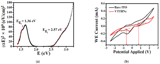 where EOX and ERED refer to the oxidation and reduction onset potentials, respectively, and the 4.4 eV refers to the absolute potential of Ag/AgCl electrode relative to the vacuum level [28,29]. From the CV plot in Figure 3b, it is observed that VTTBNc altered the oxidation and reduction peaks when compared with the bare ITO. The oxidation and reduction onset potential of VTTBNc are observed at 0.742 V and −0.662 V, respectively. Thus, the HOMO and LUMO levels of VTTBNc are determined to be at −5.14 eV and −3.74 eV, respectively, with a band gap energy of 1.4 eV. The value of band gap energy is almost the same as the value recorded from UV-Vis (1.36 eV). This suggests a small interface barrier between the electrode and VTTBNc thin film in the CV system that gives rise to the equilibrium state occurring quickly [30,31].