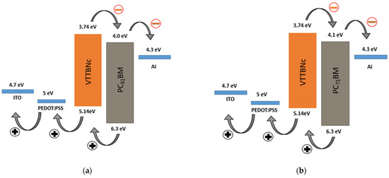The HOMO-LUMO energy levels and work function for the organic photodiode (OPD) devices (a) ITO/PEDOT:PSS/VTTBNc:PC61BM/Al (b) ITO/PEDOT:PSS/VTTBNc:PC71BM/Al.