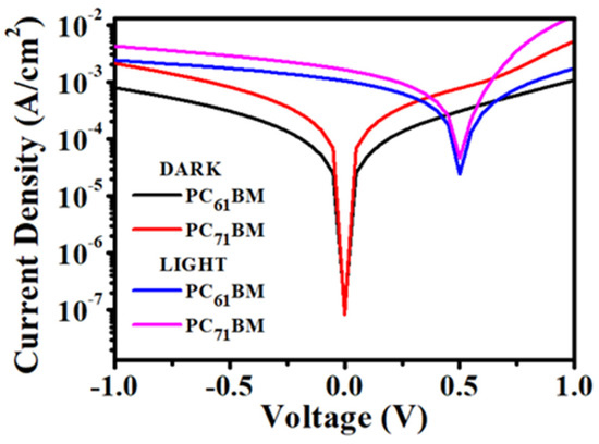 Current density–voltage (J–V) characteristics of PC61BM and PC71BM under dark and light illumination.