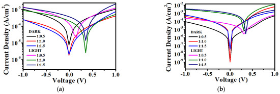 Figure 6 and Figure 7 show the current density–voltage (J–V) graphs of single materials and the BHJ OPDs examined in dark and light conditions. The J–V characteristics are investigated in reversed biased conditions to study the dark current and photocurrent generation, which later determine the responsivity and detectivity of the OPDs. The responsivity of the device refers to the electrical output produced per incident power input and can be calculated using the following equation: