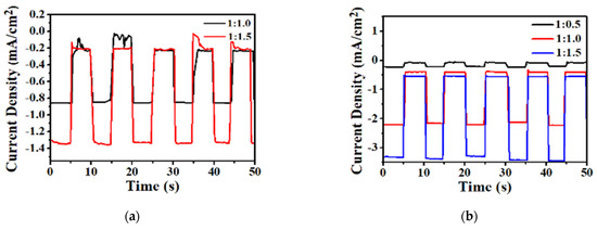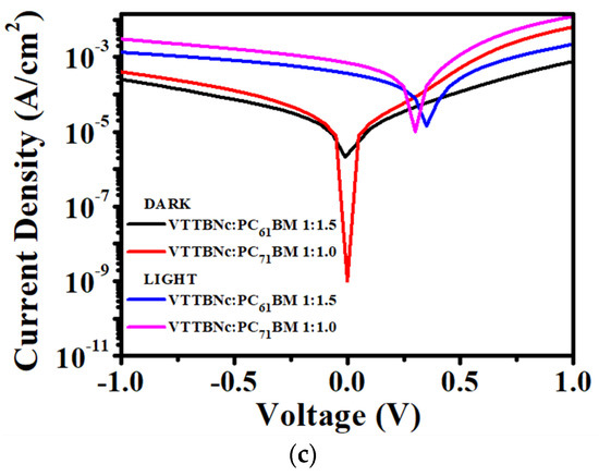 In order to improve the OPD performance, VTTBNc is blended with PC61BM and PC71BM in three different ratios. The J–V graphs of VTTBNc:PC61BM and VTTBNc:PC71BM are shown in Figure 7a,b. For the VTTBNc:PC61BM devices, the result shows the increase in the photocurrent density with increasing PC61BM content. Hence, higher PC61BM content enhances the charge carrier’s generation in the VTTBNc blends film. This elucidates the reason for the increase in the responsivity and detectivity values with the amount of PC61BM ratios. Whereby the determination of both responsivity and detectivity is directly proportional to the number of photocurrent density. The responsivity of VTTBNc:PC61BM are measured as 3.40 mA/W, 6.41 mA/W, 10.89 mA/W of ratios 1:0.5, 1:1.0, 1:1:5 at −1 V bias. The detectivities of VTTBNc:PC61BM are observed as 1.84 × 108 Jones, 7.26 × 108 Jones, 1.21 × 109 Jones of ratios 1:0.5, 1:1.0, 1:1:5 at −1 V bias. The VTTBNc:PC61BM with ratio 1:1.5 is chosen as the optimized blend ratio of VTTBNc:PC61BM blends as it has the highest responsivity and detectivity values among the other blend ratios of VTTBNc:PC61BM devices.