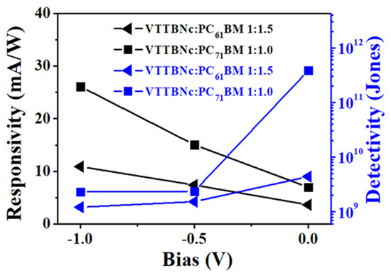 Responsivity and Detectivity of the VTTBNc:PC61BM and VTTBNc:PC71BM based on the optimized ratios.