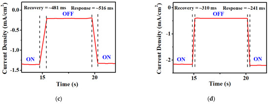 Figure 9 depicts the photo-response of VTTBNc:PC61BM and VTTBNc:PC71BM measured at −1 V in dark (OFF) and light illumination (ON) conditions by measuring the response and recovery time of the OPD device. The response time of the OPD device is counted as the photocurrents jump from the OFF to the ON states, while recovery time is counted from ON to the OFF states. The OPD devices were repeatedly measured in the ON/OFF states in five cycles with a time gap of 5 s, as illustrated in Figure 9a,b. According to Table 3, the measured response and recovery time of VTTBNc:PC71BM (1:1.0) ratio are 241 ms and 310 ms, respectively, while for VTTBNc:PC61BM (1:1.5), the response and recovery time are recorded as 516 ms and 481 ms, respectively. The results show that the VTTBNc:PC71BM (1:1.0) has a smaller or rapid response and recovery time compared to VTTBNc:PC61BM (1:1.5). Besides, as seen in Figure 9a, there are spikes or noise observed in VTTBNc:PC61BM (1:1 and 1:1.5) at the dark states while no photo-response is detected in 1:0.5 due to the weak signal and high noise detected from the experiment. These spikes might be due to the contribution of high dark current and low photocurrent generation. Meanwhile, high detectivity in VTTBNc:PC71BM caused the photo-response to have a stable detection in dark/light state. The main contribution of high dark current in small molecule OPD is due to the carrier injection phenomenon from electrodes that are caused by the low band gap characteristic in small molecules [34].