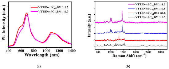 (a) Photoluminescence spectra of VTTBNc:PC61BM 1:1.5 and VTTBNc:PC71BM 1:1.0. (b) Raman spectra of VTTBNc:PC61BM and VTTBNc:PC71BM.
