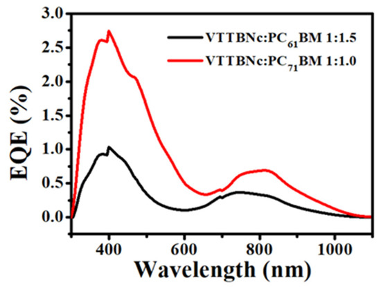 External quantum efficiency (EQE) as a function of wavelength for VTTBNc:PC61BM 1:1.5 and VTTBNc:PC71BM 1:1.0.